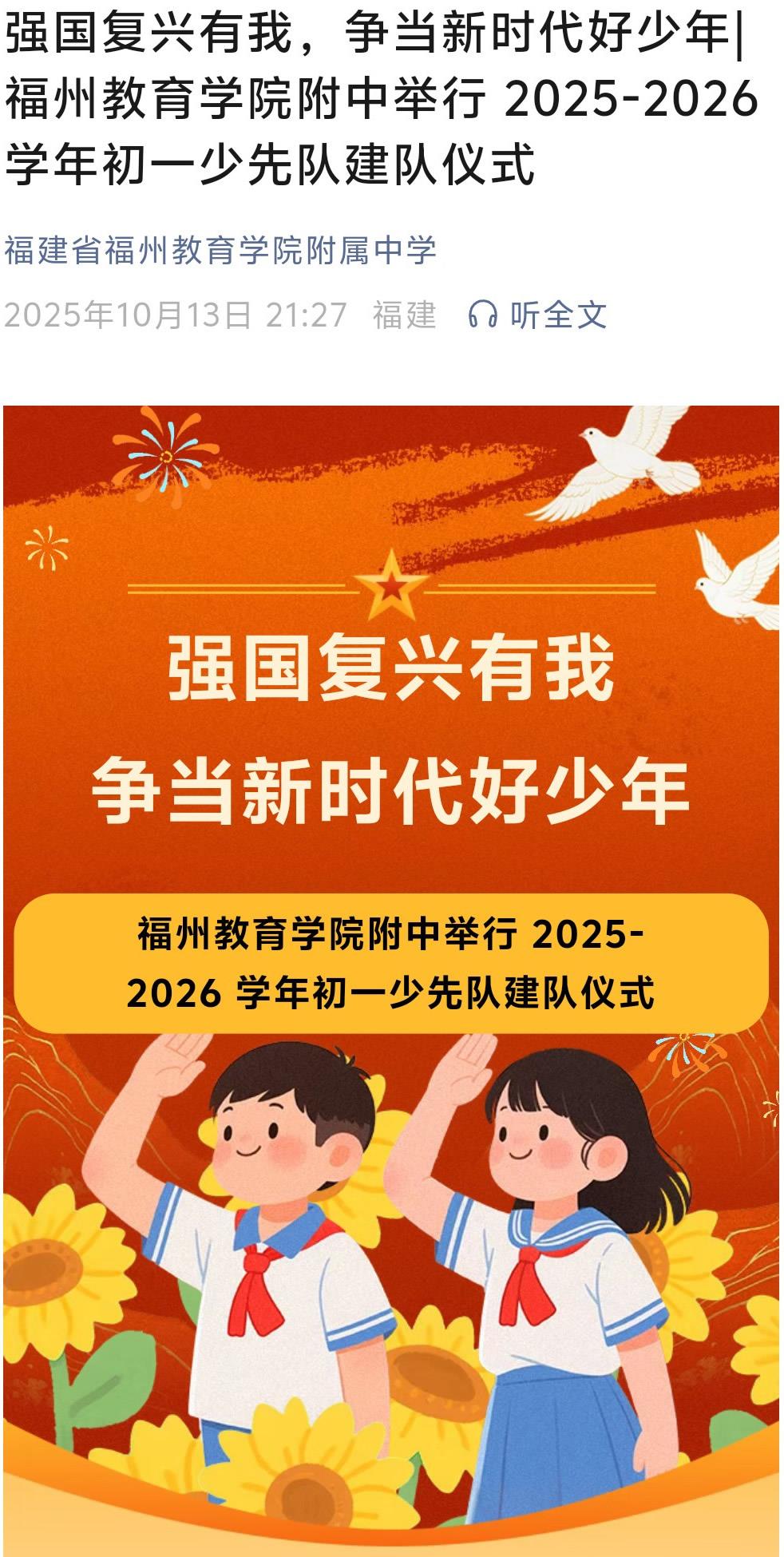 强国复兴有我,争当新时代好少年福州教育学院附中举行 2025-2026学年初一少先队建队仪式