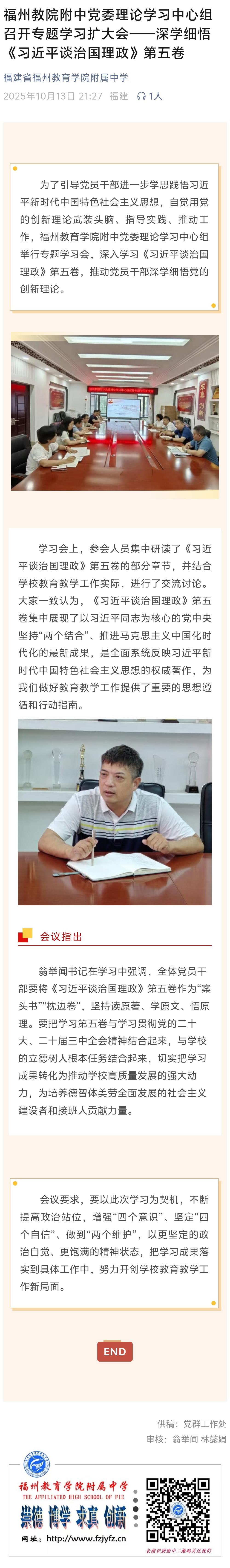 福州教院附中党委理论学习中心组召开专题学习扩大会——深学细悟《习近平谈治国理政》第五卷