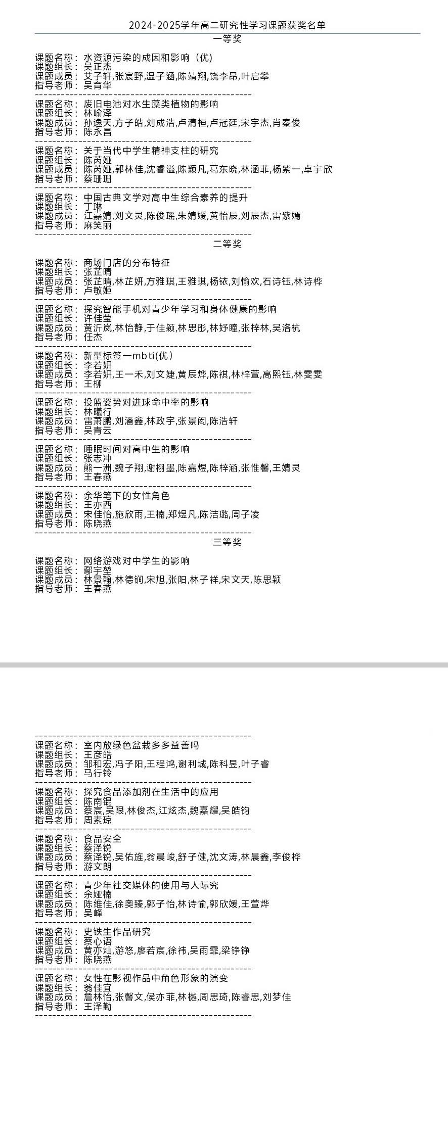 2024-2025学年高二研究性学习课题获奖名单