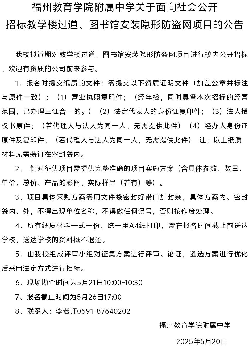 福州教育学院附属中学关于面向社会公开招标教学楼过道、图书馆安装隐形防盗网项目的公告